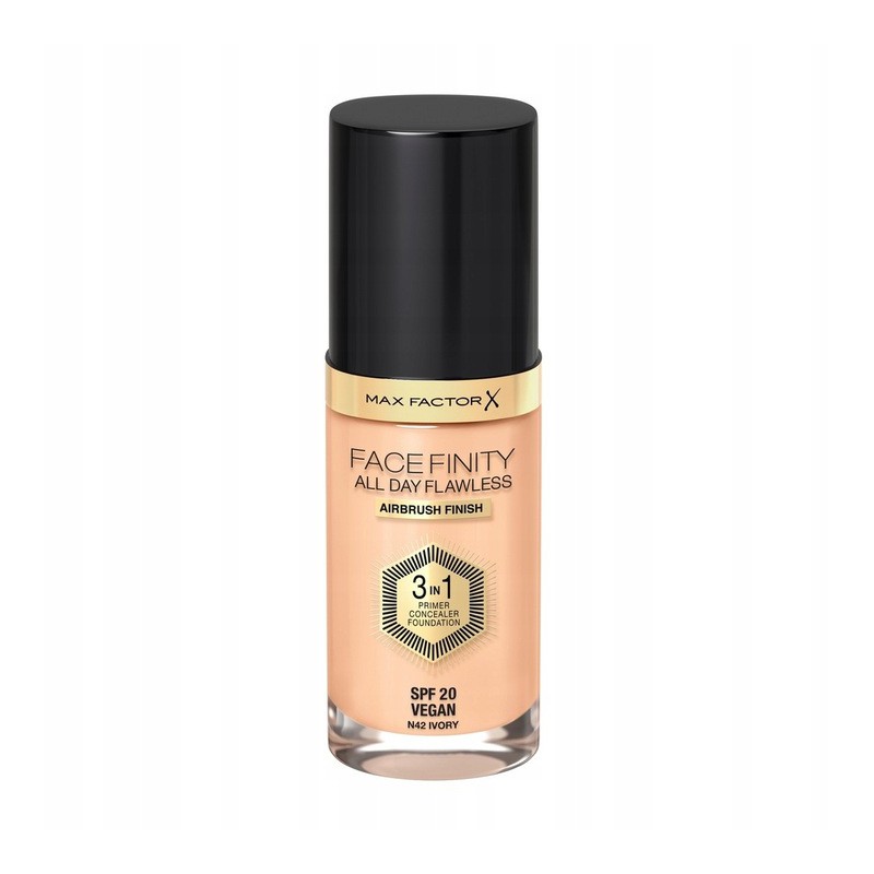 MAX FACTOR FACEFINITY 3IN1 ALL DAY FLAWLESS PODKŁAD DO TWARZY 30ML N42 utrzymuje się na skórze przez cały dzień.