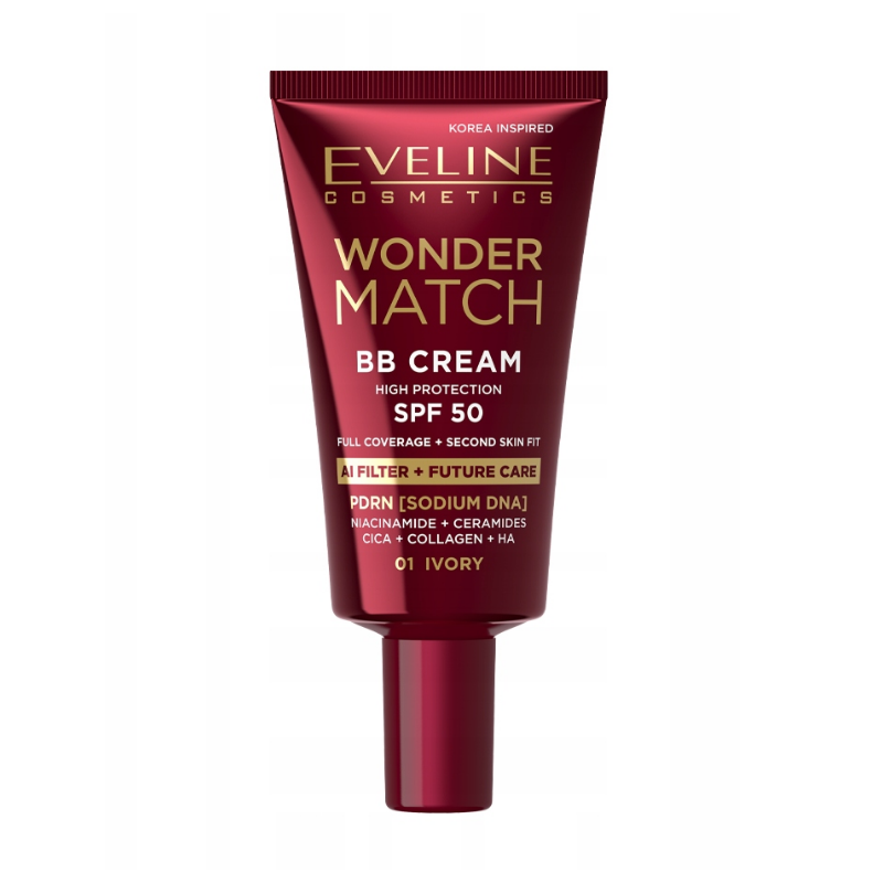 Eveline Wonder Match BB Cream SPF 50 w odcieniu 01 Ivory to wszechstronny krem BB łączący krycie, pielęgnację i wysoką ochronę przeciwsłoneczną. Lekka, dopasowująca się formuła wyrównuje koloryt skóry, maskuje niedoskonałości, nawilża cerę i chroni ją przed UV, zapewniając naturalny i promienny wygląd cery. To idealny produkt do codziennego stosowania dla osób, które oczekują wygody, ochrony i naturalnego efektu makijażu.