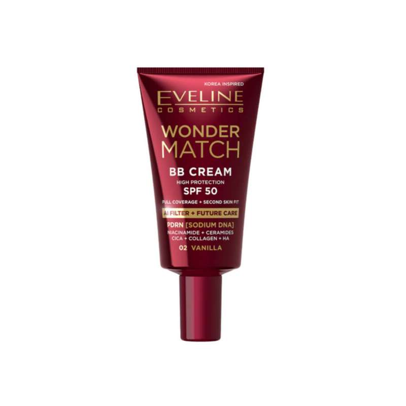 Eveline Wonder Match BB Cream SPF 50 w odcieniu 02 Vanilla to wszechstronny krem BB, który łączy krycie, pielęgnację i wysoką ochronę przeciwsłoneczną. Lekka formuła wyrównuje koloryt skóry, maskuje niedoskonałości, nawilża cerę i chroni ją przed UV, zapewniając naturalny i promienny wygląd cery. To idealny produkt do codziennego stosowania dla osób, które oczekują wygody, ochrony i naturalnego efektu makijażu.