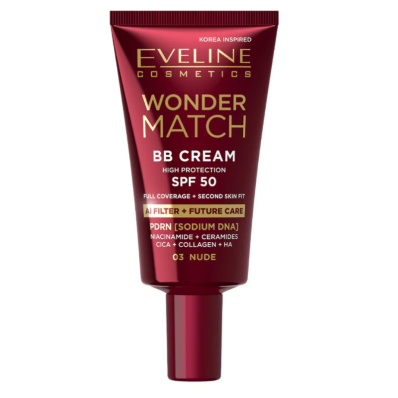 Eveline Wonder Match BB Cream SPF 50 w odcieniu 03 Nude to wszechstronny krem BB łączący krycie, pielęgnację i ochronę przeciwsłoneczną. Lekka, dopasowująca się formuła wyrównuje koloryt, maskuje niedoskonałości, nawilża skórę i chroni ją przed słońcem, zapewniając naturalny, promienny wygląd cery. To idealny kosmetyk do codziennego użytku dla osób oczekujących wygody, ochrony i naturalnego efektu.
