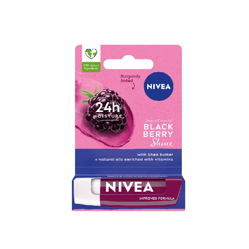 Nivea Blackberry Shine 24h Nawilżająca Pomadka Ochronna do Ust o wadze 4,8 g. To pomadka, która nie tylko intensywnie pielęgnuje usta, ale także nadaje im delikatny jagodowy odcień i połysk.