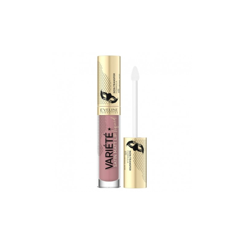 Matowa pomadka w płynie Eveline Variete 02 Caramel Cake — trwały kolor i komfort noszenia z kwasem hialuronowym i witaminą E.