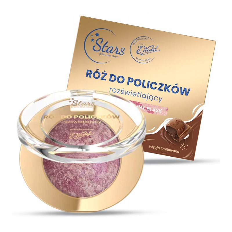 Stars from the Stars × E. Wedel „Harmonijny Blask” to wyjątkowy róż rozświetlający, który łączy piękny efekt makijażu z przyjemnym zapachem czekolady. Jego marmurkowa konsystencja, trwałość i wysoka pigmentacja sprawiają, że idealnie nadaje się zarówno do codziennego makijażu, jak i na specjalne okazje.