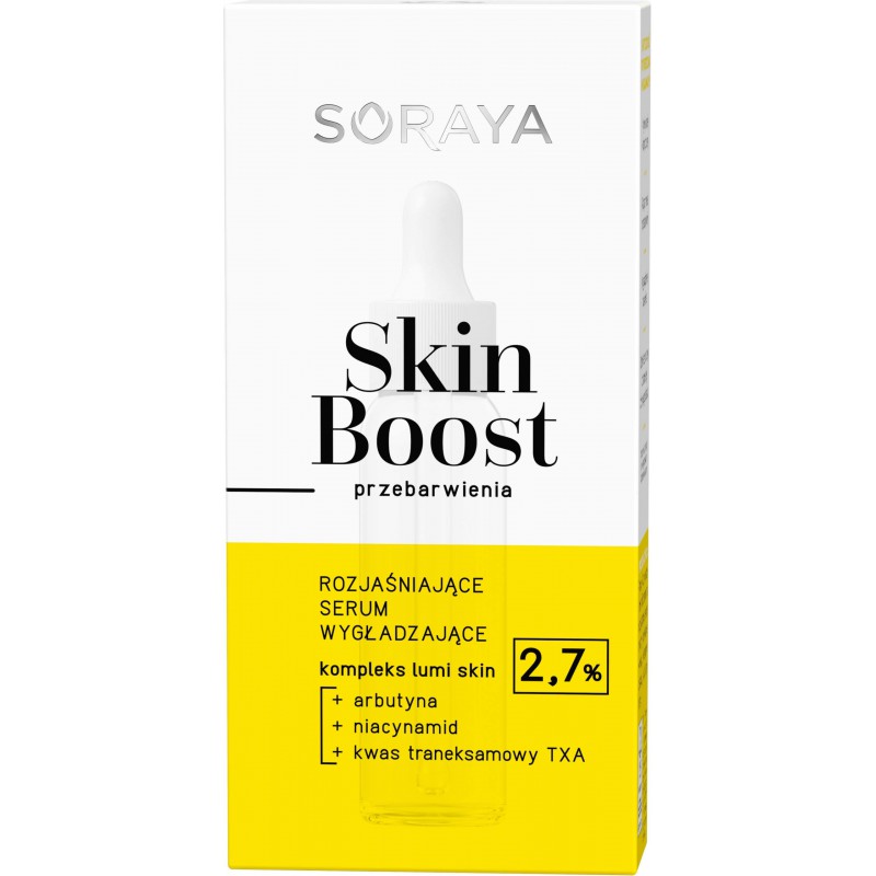 SORAYA SKIN BOOST SERUM DO TWARZY 30ML NA PRZEBARWIENIA zapobiega powstawaniu przebarwień, rozjaśnia już istniejące plamy pigmentacyjne, wyrównuje koloryt cery i widocznie ją wygładza.