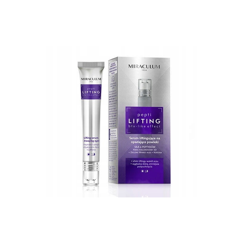 Miraculum Pepti Lifting Serum Liftingujące na Opadające Powieki 20 ml to wysokiej jakości serum pielęgnacyjne, które działa intensywnie na delikatną skórę wokół oczu, poprawiając jej elastyczność, ujędrniając oraz redukując oznaki starzenia i opadania powiek. Produkt idealny jako element codziennej pielęgnacji skóry oczu.