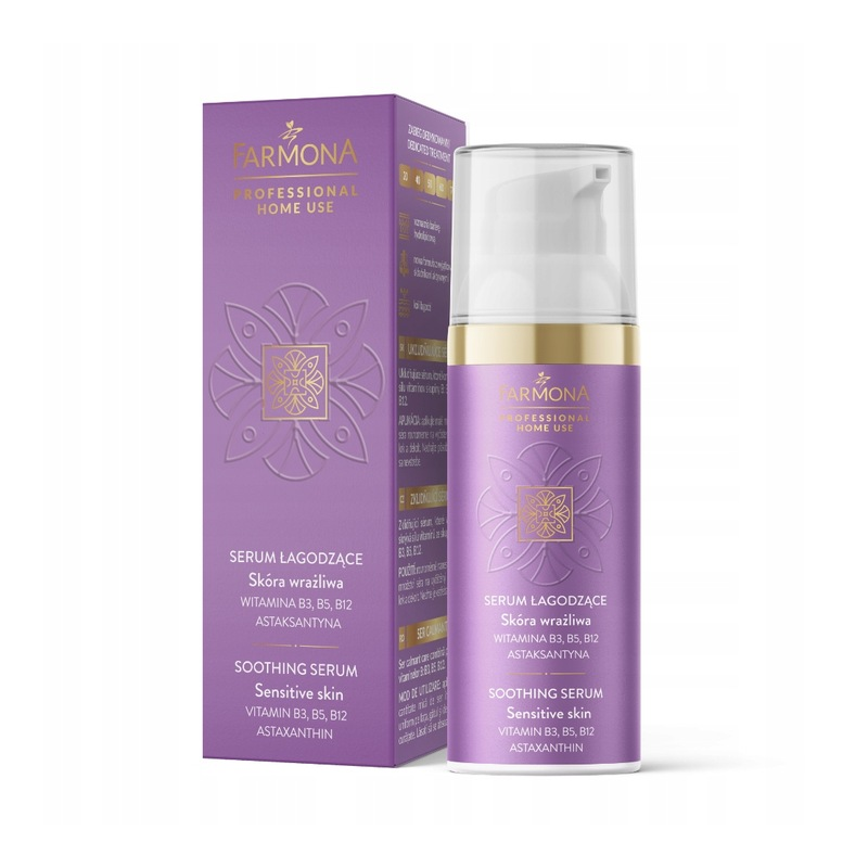 Delikatne serum łagodzące Farmona Home Use 50 ml – intensywne nawilżenie i ukojenie skóry wrażliwej z witaminami B3, B5, B12 i astaksantyną.