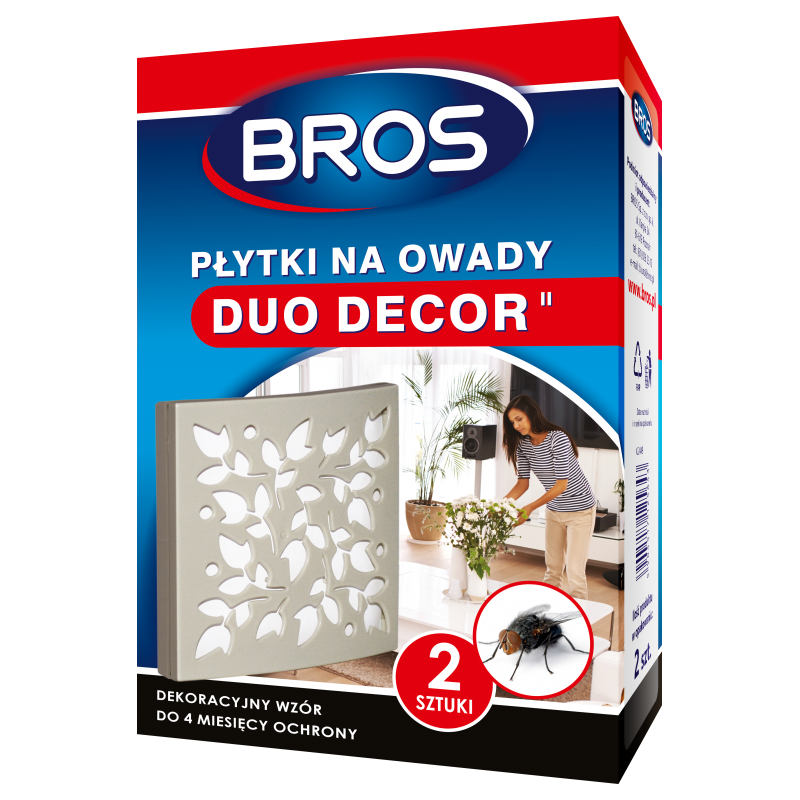 Dwie dekoracyjne płytki do zwalczania mrówek i owadów latających (muchy, komary, meszki, muszki owocówki i dorosłe osobniki moli odzieżowych) w pomieszczeniach. Mogą być stosowane razem lub osobno, w zależności od wielkości zabezpieczanej powierzchni. Subtelny, elegancki wzór w połączeniu z dyskretnym kolorem sprawiają, że płytki Duo-Decor pasują do każdego pomieszczenia. Płytka zaczyna działać od razu po rozpakowaniu, uwalniając stopniowo substancje aktywne, które wnikają w szczeliny i likwidują nawet głęboko ukryte owady. Pełna skuteczność występuje po ok. 48 godz. od jej wystawienia. Płytki stosowane jedna po drugiej, skutecznie chronią pomieszczenie aż do 4 miesięcy (obie płytki zapakowane są w oddzielne opakowania foliowe, które zabezpieczają substancję czynną przed jej uwalnianiem).
