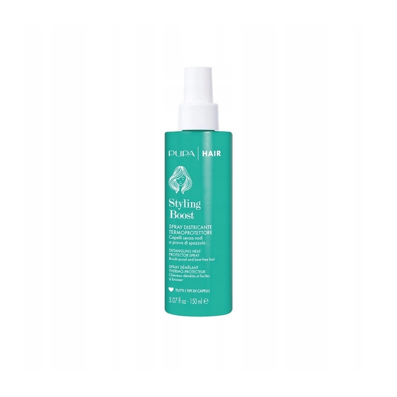 Pupa Styling Boost to wielofunkcyjny spray do włosów, który zapewnia ochronę termiczną przed wysoką temperaturą urządzeń do stylizacji oraz ułatwia rozczesywanie pasm po myciu. Lekka formuła produktu tworzy na włosach ochronną powłokę, która minimalizuje ryzyko ich uszkodzeń i przesuszenia podczas suszenia, prostowania czy kręcenia. Spray zapobiega również plątaniu się włosów, znacznie ułatwiając ich rozczesywanie i poprawiając komfort codziennej pielęgnacji.