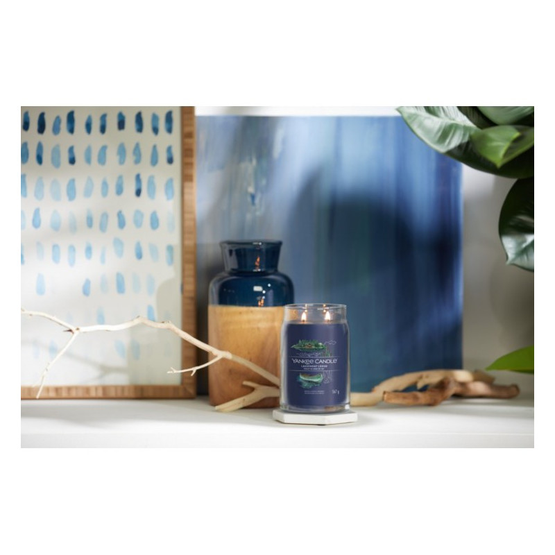 YANKEE CANDLE SIGNATURE ŚWIECA TUMBLER 567G LAKEFRONT LODGE mieszanka aromatu sosny i drzewa cedrowego dopełniona nutą świeżego powietrza, ziaren Tonka i żywicy.
