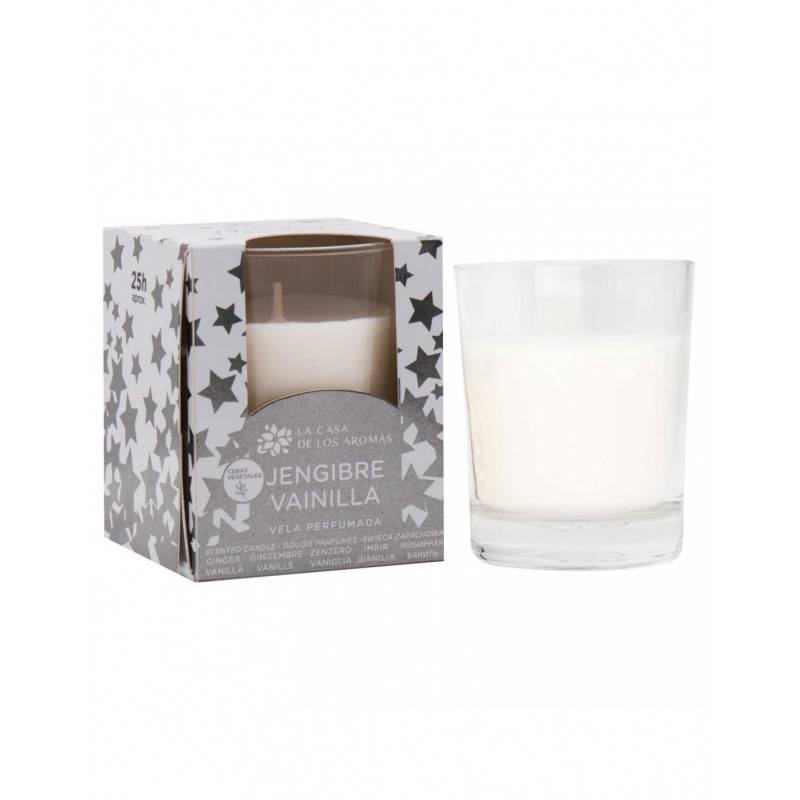 LA CASA DE LOS AROMAS X-MAS ŚWIECA ZAPACHOWA 120G IMBIR-WANILIA w bezbarwnym szkle o aromacie imbiru i wanilii.