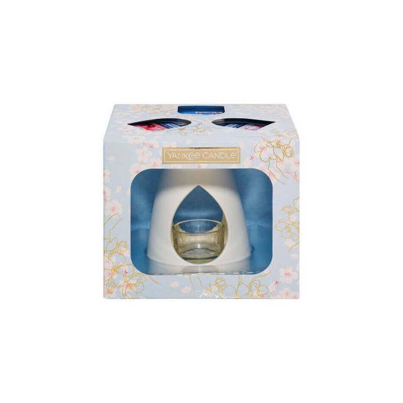 Wewnątrz pudełka znajduje się biały kominek do topienia wosków, który ma zakrzywioną górę, specjalnie zaprojektowaną do topienia wosku Yankee Candle, oraz dwa otwory w kształcie łzy po obu stronach, w którym umieszczamy tealight. Do tego dochodzą trzy tarty woskowe, które mają czas palenia do 8 godzin każda i bezzapachowy tealight do ich rozpuszczenia! Zapachy wosków: