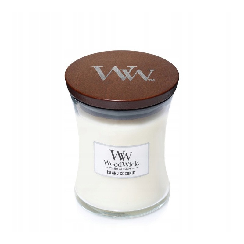 WOODWICK ŚWIECA 275G ISLAND COCONUT soczysty ananas zmieszany z kremowym kokosem tworzy perfekcyjną, kuszącą, tropikalną kompozycję.