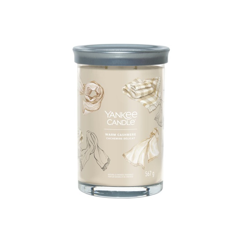 YANKEE CANDLE SIGNATURE ŚWIECA TUMBLER Z DWOMA KNOTAMI 567G WARM CASHMERE otul się luksusem wyciszających nut drzewa sandałowego i egzotycznej paczuli.