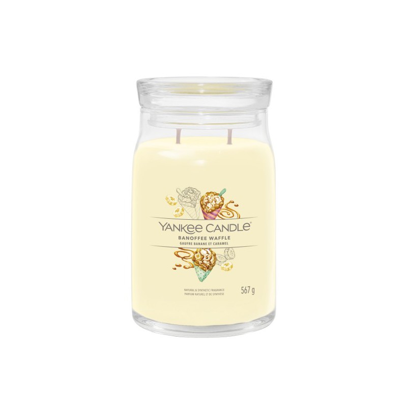 YANKEE CANDLE SIGNATURE ŚWIECA 567G BANOFFEE WAFFLE Słodki waniliowy wafelek wypełniony gałką lodów bananowych oblanych karmelem i czekoladą.