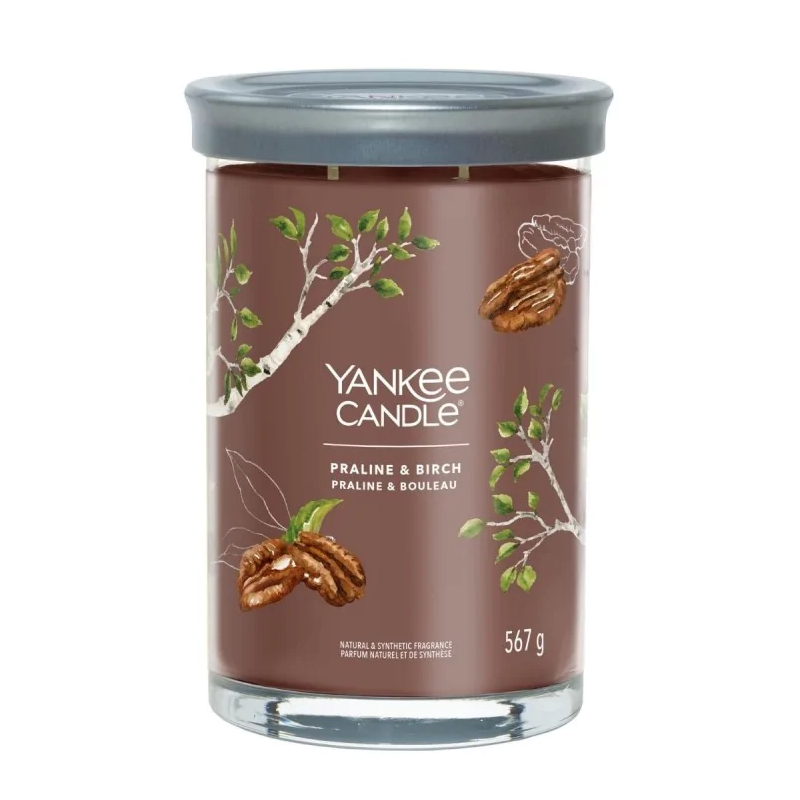 YANKEE CANDLE ŚWIECA SIGNATURE TUMBLER 567G PRALINE & BIRCH Aromat czekoladowych pralinek połączony z nutami drzewa sandałowego, bursztynu i wanilii.