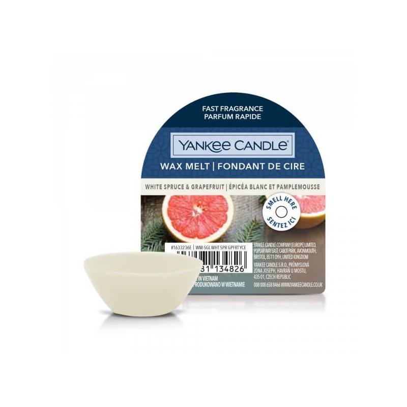 YANKEE CANDLE WOSK 22G WHITE SPRUCE & GRAPEFRUIT Orzeźwiający zapach grejpfruta i soczystych cytrusów w połączeniu z nutami jodły balsamicznej, wanilii i piżma.