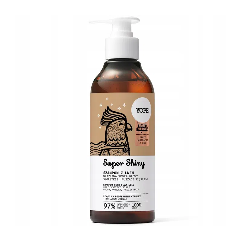 YOPE Daily Heroes Super Shiny z lnem to szampon, który łączy skuteczność z delikatnością, dbając o kondycję włosów oraz komfort skóry głowy. Idealny dla całej rodziny i do każdego rodzaju włosów.