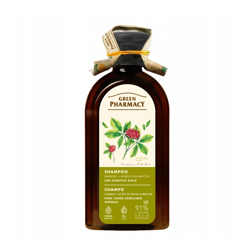 Szampon Green Pharmacy z żeń-szeniem i marokańskim olejkiem miętowym został stworzony z myślą o pielęgnacji wrażliwej skóry głowy. Jego formuła łagodzi podrażnienia, nawilża oraz przywraca komfort, pozostawiając włosy zdrowe i pełne blasku.