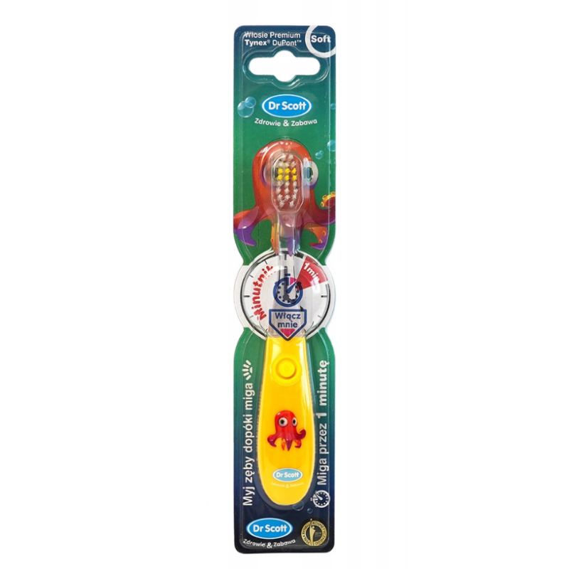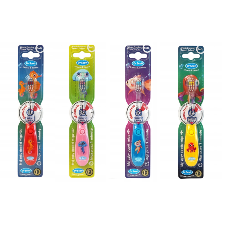 Szczoteczki Dr. Scott zostały stworzone z myślą o najmłodszych, aby codzienne mycie zębów stało się nie tylko obowiązkiem, ale także świetną zabawą. Dzięki wbudowanemu minutnikowi – migającemu lub dźwiękowemu – dziecko uczy się, jak długo powinno szczotkować zęby, co wspiera zdrowe nawyki higieniczne od najmłodszych lat. Przyjazne wzory zwierzątek sprawiają, że dzieci chętniej sięgają po szczoteczkę i czerpią radość z dbania o uśmiech.