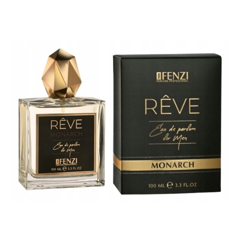JFenzi Reve Monarch to męska woda perfumowana stworzona dla charyzmatycznych i pewnych siebie mężczyzn. Zapach otwiera się świeżymi nutami cytrusów oraz aromatyczną lawendą i tymiankiem, które nadają energii i wyrazistości. W sercu kompozycji pojawiają się akordy owocowo-kwiatowe, łączące soczyste owoce z eleganckimi nutami jaśminu i kwiatu pomarańczy. Całość wieńczy głęboka, zmysłowa baza z nutami drzewnymi, skóry, bursztynu i wanilii, zapewniająca trwałość oraz intensywny charakter zapachu.
