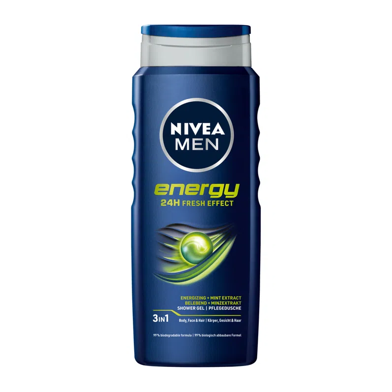Nivea Men Energy to żel pod prysznic 3w1 przeznaczony do codziennego oczyszczania ciała, twarzy i włosów. Jego formuła została wzbogacona o kofeinę pochodzenia naturalnego, która pobudza i orzeźwia skórę, zapewniając uczucie świeżości przez cały dzień. Produkt ma pH przyjazne dla skóry i jest w 99% biodegradowalny, co czyni go bezpiecznym zarówno dla użytkownika, jak i dla środowiska. Dodatkowo, nie zawiera mikroplastików.